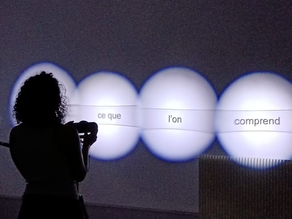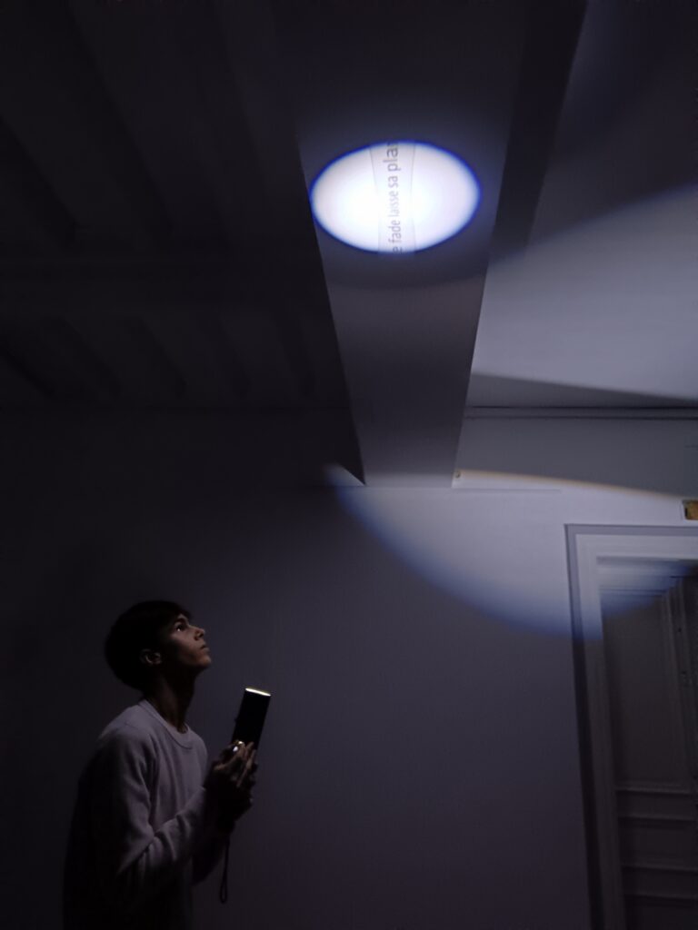 A travers le dispositif d’éclairage avec des lentilles créé par leur professeur d’arts plastiques, les élèves ont pu mettre en espace de manière individuelle leur texte. Par exemple, une élève a fait défiler son texte par projection sur un miroir, dans une salle plongée dans le noir.