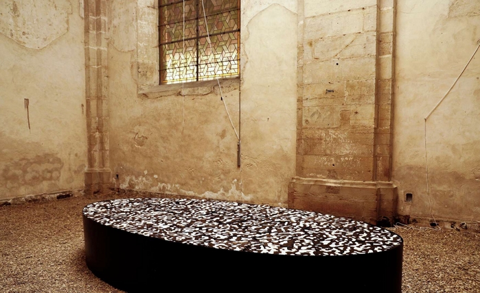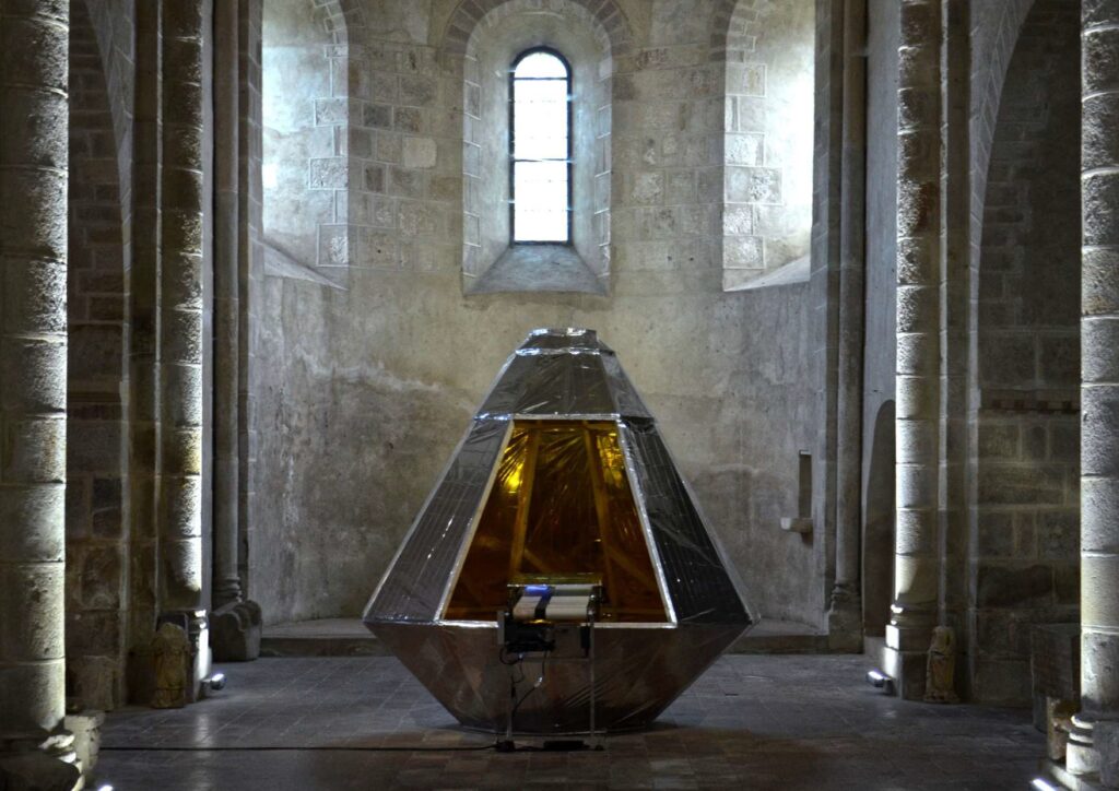 L’artiste a créé un dispositif avec des matériaux pauvres et de survie pour créer cette capsule. Sur un tapis roulant à l’intérieur de la capsule, défilent des textes narrant l’histoire de la conquête spatiale, qui, tout en défilant s’altèrent grâce à un système d’ultra-violets, condamnant les écrits à disparaître au fur et à mesure de leur présentation.