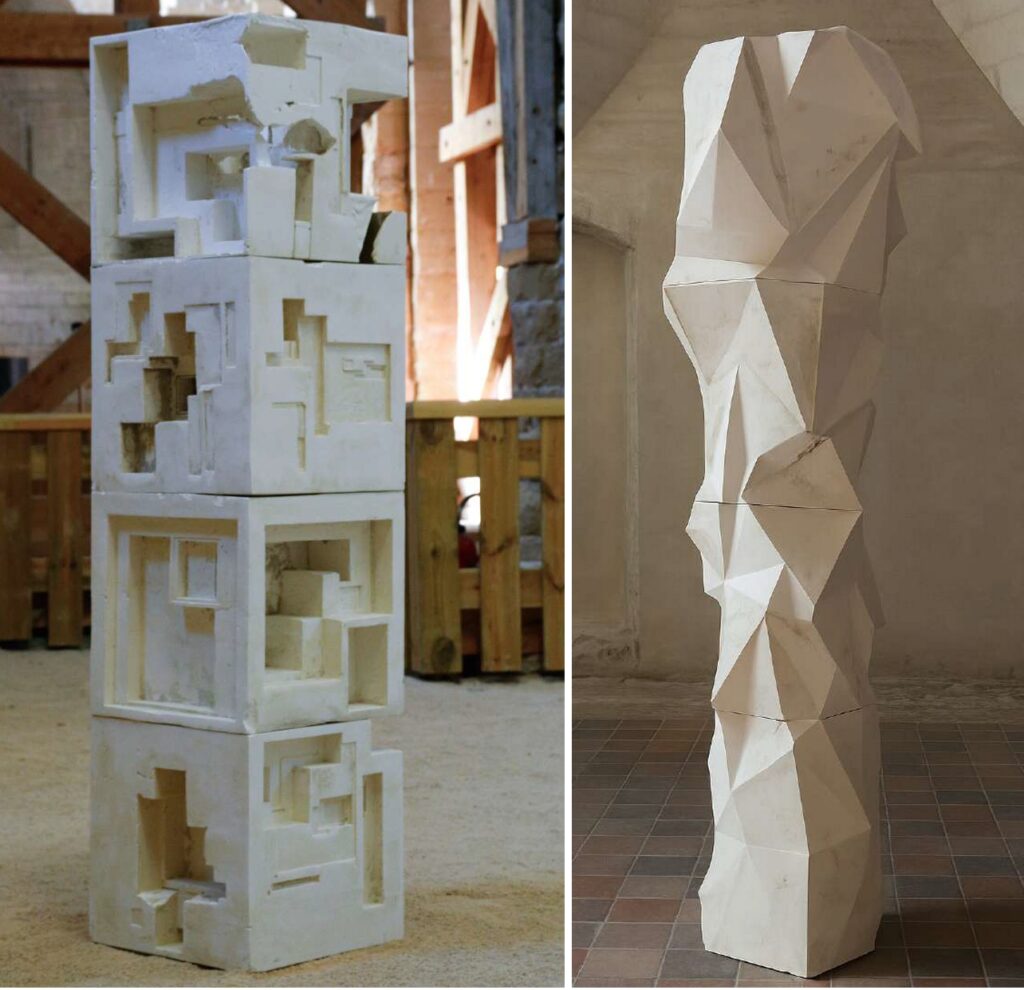 Maëva explore ainsi des thèmes liés au design, à l’architecture mais aussi liés à la construction notamment avec des totems en plâtre qu’elle réalise entre 2020 et 2023, Oligophrène et Odontophobe s’inspirant de l’observation de grains de sels au microscope.