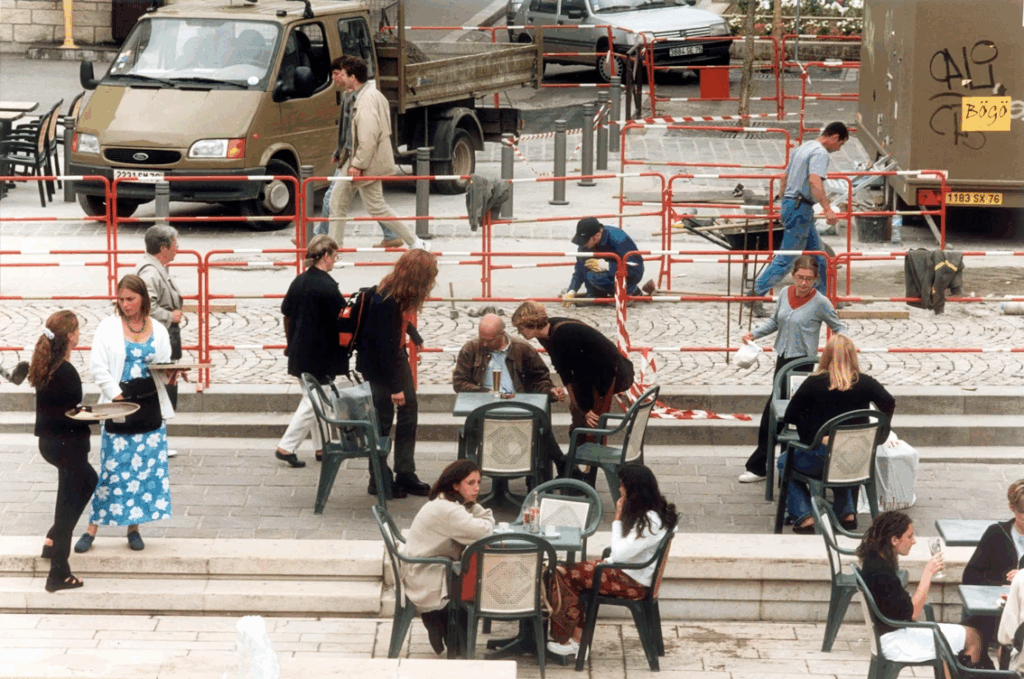 Dans Ensembles (1997-2000), la lumière du jour remplace celle des néons. Darzacq observe cette fois les comportements des individus dans l’espace public. Il garde pourtant la même posture : celle de l’observateur discret. Depuis un point en hauteur, à l’aide d’un téléobjectif, il saisit des scènes anodines où tout devient sujet. Il n’y a plus de hiérarchie dans l’image : chaque fragment de réalité a la même valeur, chaque geste banal devient digne d’attention. Par contraste avec Only Heaven, ici, tout est net, clair, frontal. Le regard du photographe se détache de la nuit et du flou pour embrasser la multiplicité du réel.