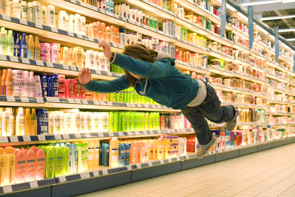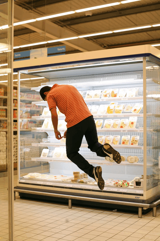 Hyper (2007), prolongement direct de La Chute, transpose ces corps dans le décor froid et géométrique du supermarché. L’éclat artificiel des néons et la répétition des produits construisent un univers aseptisé, symbole de la consommation de masse. Au milieu de cet ordre parfait, les corps flottent, inutiles, presque absurdes. Leurs gestes n’ont plus de fonction — ils deviennent poétiques dans un lieu dominé par la marchandise. La lumière blanche, glaciale, accentue la neutralité du lieu et le contraste avec la vitalité humaine. Darzacq oppose ici la rigueur marchande au désordre du vivant.