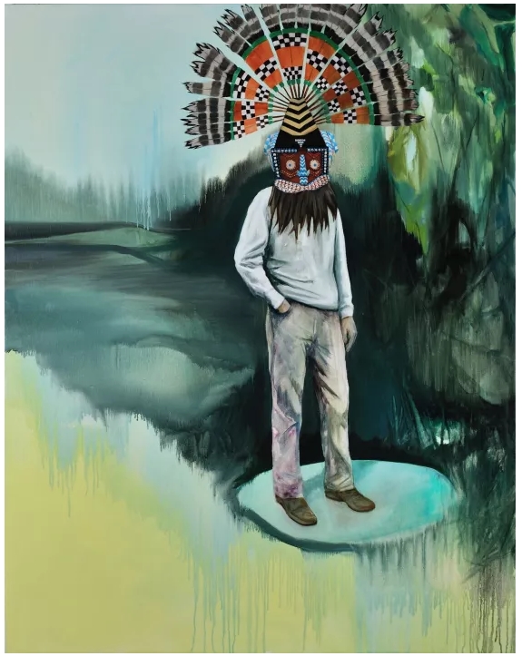 Bientôt un pouvoir est une huile sur toile de Romain BERNINI (1979-), celle-ci fait partie de la série Cargo Cult composée de 5 peintures qui représentent chacune des masques différents en liens avec des îles distinctes, ayant pour habitants des ethnies mélanésiennes. Cependant la composition de ces toiles reste similaire : un personnage central habillé dans un style universel qui est contrasté par le