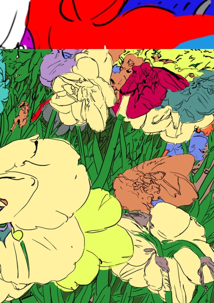Les fleurs montrent une nature qui ne parle pas de beauté, mais d’accumulation. La peinture est brouillée et n’est pas simple à comprendre. Le spectateur doit trouver son propre sens.