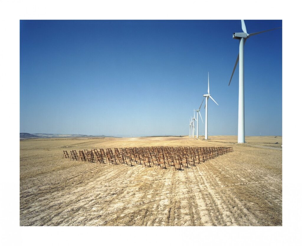 Espectadores est une photographie prise par un autre artiste catalan, Aleix PLADEMUNT (1980- ) en 2006. Ses œuvres s’attardent en une réflexion visuelle sur la relation qu’entretient l’humanité avec l’espace naturel et urbain. Dans Espectadores il n’y a plus de végétation, seulement une rangée d’éoliennes et devant elles se placent un regroupement de chaises vides.