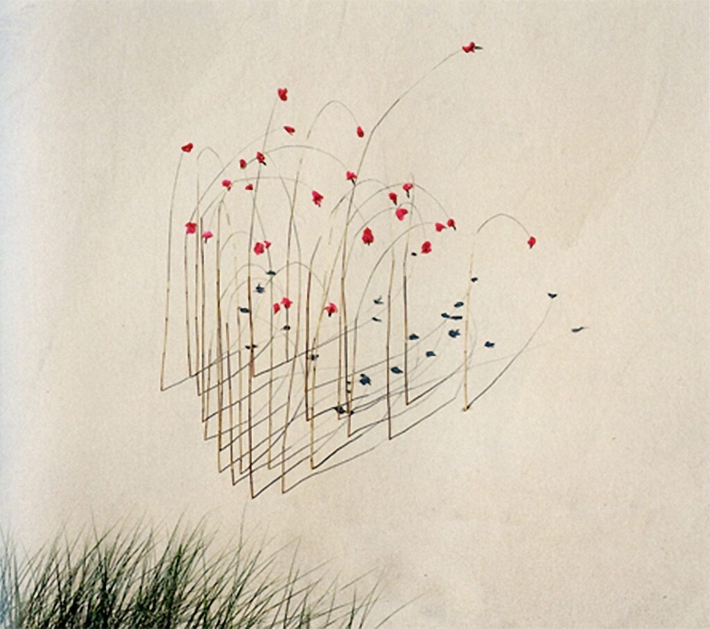 L’artiste allemand Nils UDO (1937 – ) propose sa vision propre de la nature. Il compose avec ce qu’il trouve sur place : des roseaux, des herbes et des pétales de fleurs. Son “installation éphémère” et légère semble en mouvement et faire déjà partie du milieu naturel.